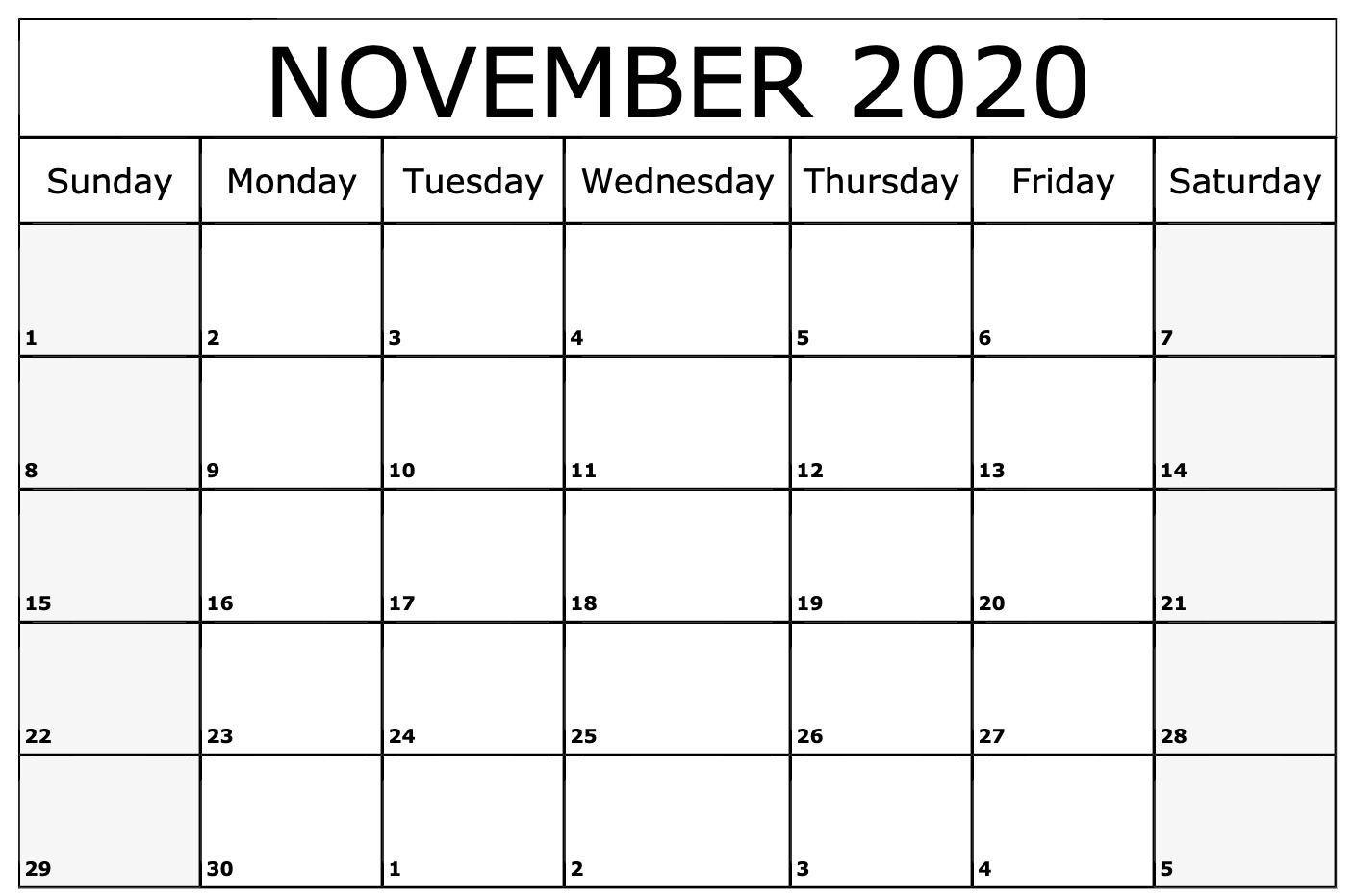 The printable calendar november 2020 is a free printable calendar that has the alternatively greyed out weekdays.