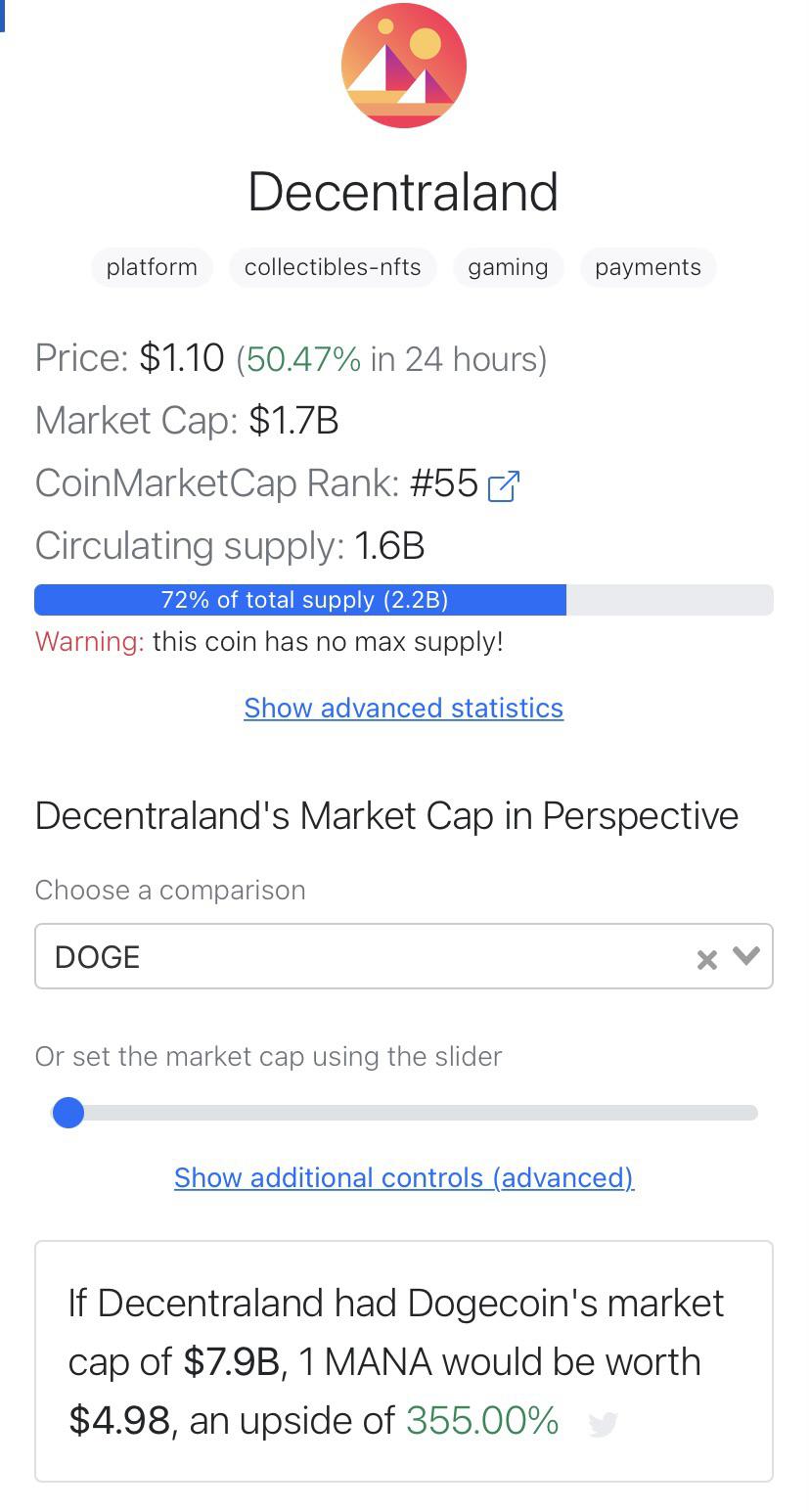 Circulating supply, price, volume (24h), change (24h), price graph (7d). See insights on decentraland including price, news, research, . Decentraland (mana) is currently trading at $3.73, up 3.57% in the last 24 hours. Decentraland is ranged as 83 in the global cryptocurrency rating with an . 1, bitcoin price bitcoin, 962,541,205,111, 18,893,718, $50,959.00 . Decentraland (mana) is a digital asset with the market capitalization of $5.69b. View live mana/usd chart to track latest price changes. $1.46 b · circulating supply. The current coinmarketcap ranking is #25, with a live market cap . $9.55 b · volume 24h. $5.78 b · fully diluted valuation. Trade ideas, forecasts and market news are at your disposal as well. Decentraland's mana token has surged roughly 37% over the last seven days of trading.