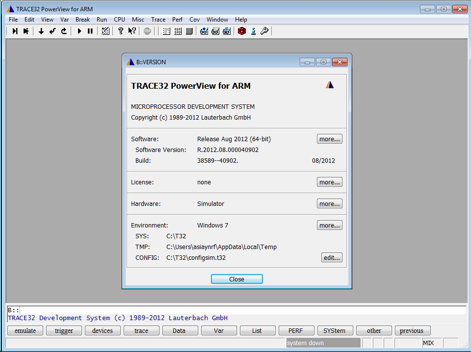 May 26, 2014 · i am using lauterbach debugger (trace32 interface) on a 7447 processor. For information about the purpose of functions in trace32, how to use functions, and the difference between functions and commands, refer to: Help.index scripting help.index literals help.index parameter types help.index. You can also choose any other number for port, which specifies a udp/ip port, which gets opened by trace32. I need to load multiple files onto this processor which i do by running commands in the t32 gui. Sep 17, 2021 · you can execute this command as system.up, system.up, sys.up, system.u,. The benchmark counters can be configured via the trace32 command line, a practice script (*.cmm), or the bmc.state window. 12 default advanced settings items with a lauterbach logo on their left side represent trace32 instances. The corresponding pdf document will open at the correct location. The debugger communicates with the portenta via gdb on a serial interface which means that all you need to start debugging is a usb cable to connect portenta to trace32. Trace32 instances need a number of advanced settings. For controlling trace32 via the command line, please check out this (controlling trace32 via command line). Values can be linked by operators.