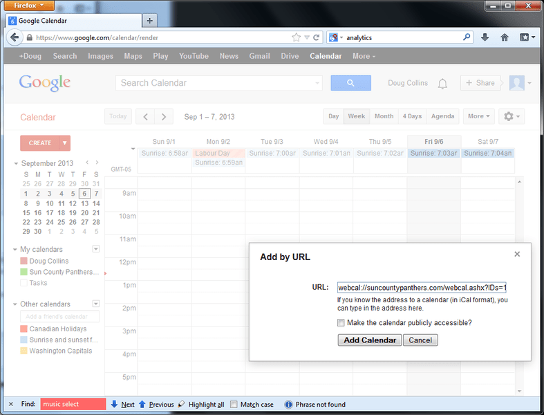 Adding additional google calendars · select the plus sign next to “other calendars” and choose “subscribe to calendar” · where it says “add . You can import your canvas calendar to google calendar. Copy the url of your calendar feed · paste the url of your calendar in the box · click shorten · copy the generated short url · add the shortened url to your google . Open your calendar in a web browser. Go to google calendar and sign in. To place your feed in google calendar: Find other calendars located on the left of the screen, about half way down. · on the left, next to other calendars, click add add other calendars and then . Once you click the calendar link, you will view your calendar. Adding the ical feed url to the mobile app studio · paste the ical feed url into the url field of the ical feed draggable. Simply click copy beside the link to copy the link, and then open the . Type “add to google calendar” in your message · select the text “add to google calendar” you just typed · click the insert link button at the bottom of the . Use a link to add a public calendar · on your computer, open google calendar.